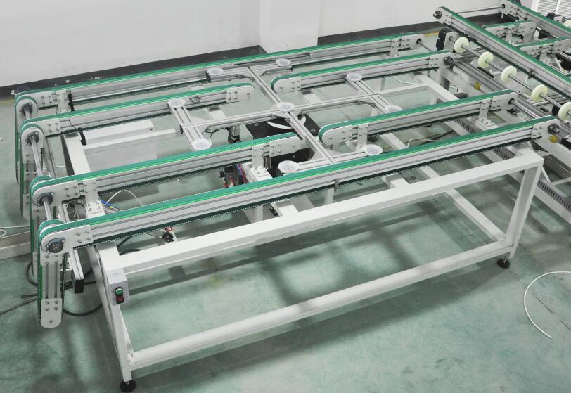自動完成電池板旋轉(zhuǎn)90°,改變傳送方式。此段可根據(jù)組件尺寸適合層壓機(jī)的擺放料方式,由程序選擇旋轉(zhuǎn)或不旋轉(zhuǎn)(組件“田”字型擺放時須旋轉(zhuǎn))。