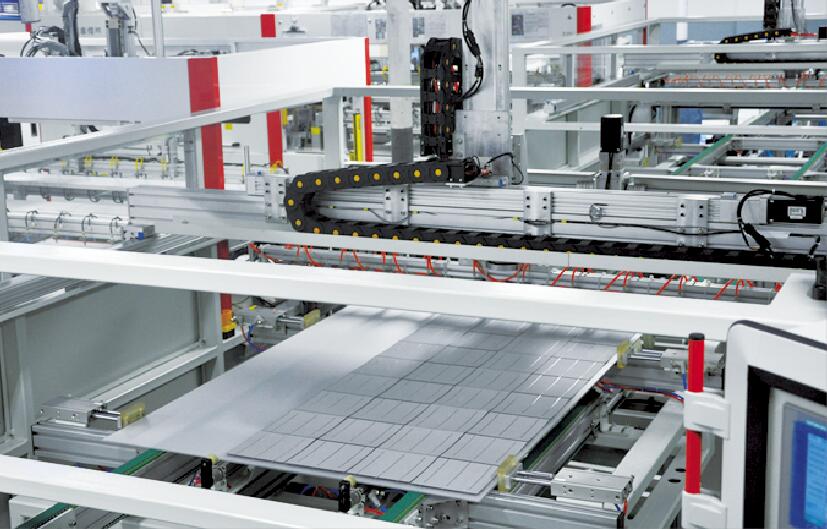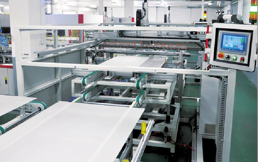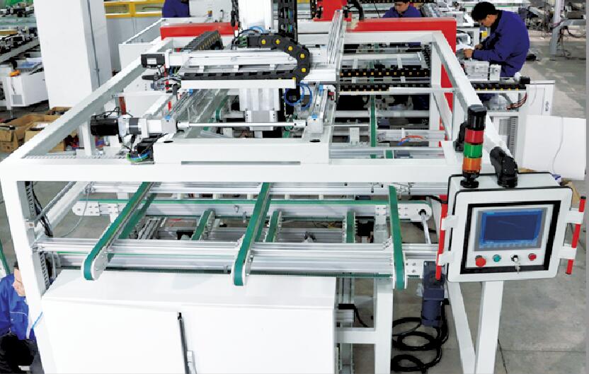 此設(shè)備用于將自動串焊機(jī)串焊好的電池串,按照工藝尺寸要求和排版方向順序自動排版鋪設(shè)到玻璃/EVA上,組成電池串陣列。玻璃/EVA通過傳輸線傳輸至指定位置,并進(jìn)行機(jī)械定位,四軸機(jī)械手抓取電池串實(shí)現(xiàn)智能相機(jī)檢測缺陷、定位、自動旋轉(zhuǎn)、自動排版功能。設(shè)備通過同步帶傳輸與自動生產(chǎn)線對接,實(shí)現(xiàn)了自動流水作業(yè)。