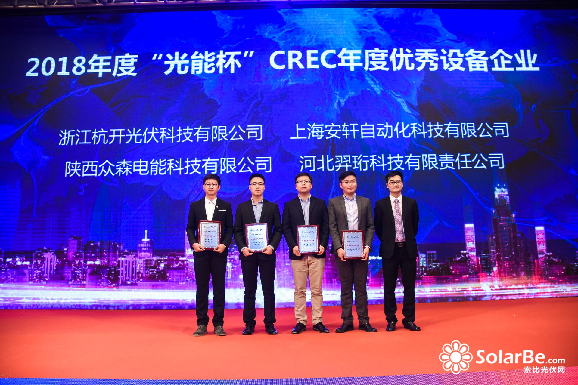 2018年10月31日,由solarbe索比光伏網(wǎng)、中國(無錫)國際新能源大會暨展覽會CREC、《光能》雜志共同主辦的2018 CREC光能杯光伏行業(yè)評選年度頒獎典禮在無錫盛大舉行。河北羿珩科技有限責(zé)任公司(以下簡稱“羿珩科技”)作為中國專業(yè)太陽能光伏裝備制造商,榮獲“年度優(yōu)秀設(shè)備企業(yè)”大獎。本年度"光能杯"光伏行業(yè)獎評選活動共吸引數(shù)百家中國光伏行業(yè)重量級企業(yè)參選,是2012年以來最多的一屆